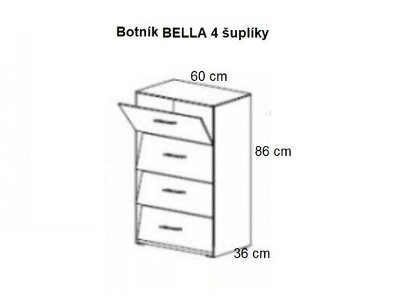 Bojíte se nechávat své boty na prahu dveří do bytu? Pořiďte si botník Bella 1 a uložte je do něj. Tento velice praktický botník se 4 výklopnými dvířky umožňuje uskladnit více páru obuvi. Pro svou malou hloubku, je možné ho umístit i do menších či užších prostorů. Bella botník je vyráběn ve dvou barevných provedení: dub sonoma a bílá. Svým jednoduchým designem se bude hodit do každé předsíně i každému věšáku. Vlastnosti: *laminovaná dřevotříska (LTD) o síle 16 mm hrany jsou zakončeny ABS lištou zadní stěna sololitová deska úchyty plast