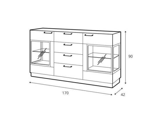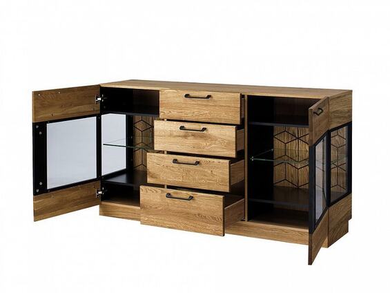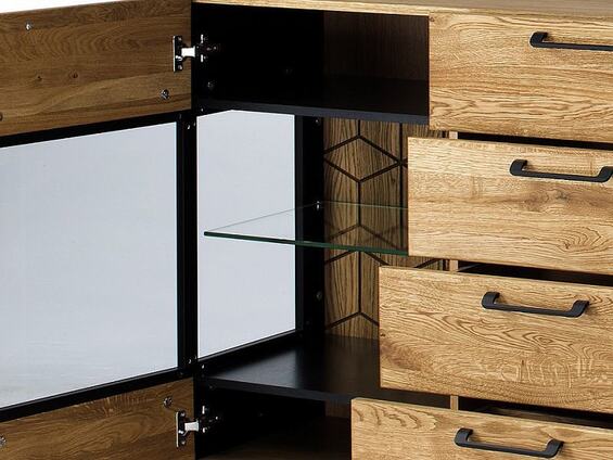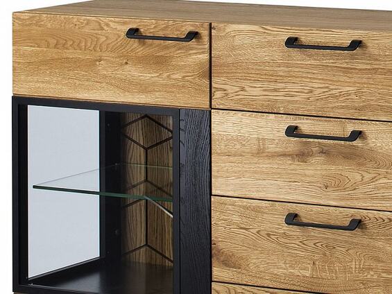 Komoda Monuriki má prakticky rozdělené členění. Šuplíky a police (z toho dvě jsou tvořeny tvrzeným sklem).