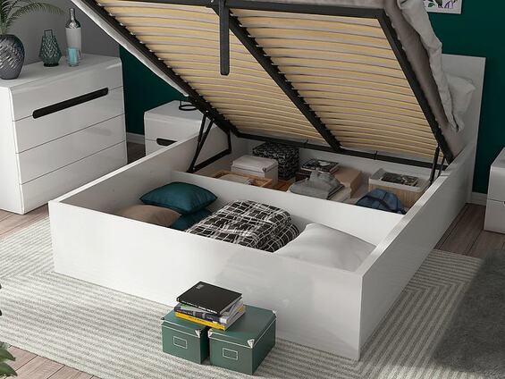 - postel je se zvedacím roštem, kovovým rámem a úložným prostorem.