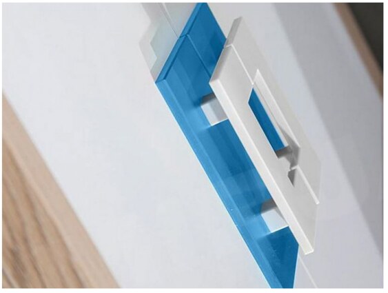 Psací stůl Nikos 10 je vyroben z lamina ve světlých tónech bílá/dub jasný. Úchyty jsou zhotoveny z tyrkysové barvy,