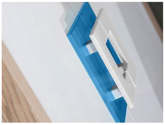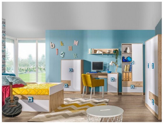 Psací stůl Nikos 11 je vyroben z lamina ve světlých tónech bílá/dub jasný. Úchytky jsou v kombinaci bílá/tyrkys.