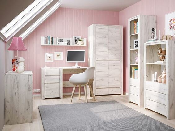 Tato kolekce obsahuje komody, šatní skříně, police, postele, psací stůl, regály a úložné prostory. Skvěle se hodí pro vybavení pokoje kluka či holčičky, studenta nebo studentky.