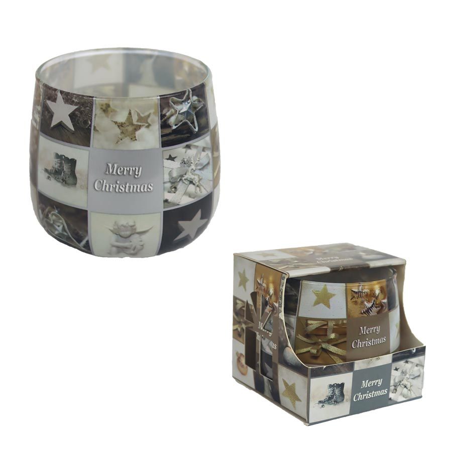 Svíčka vonná ve skle - MERRY CHRISTMAS. Sklo má průměr 7,5 cm, výšku 7,8 cm. Svíčka ve skle s příjemnou vůní skvěle provoní Váš byt a zároveň může posloužit i jako dekorace.