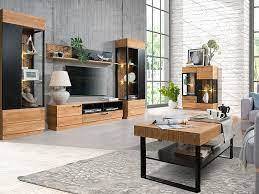 Na modernosti nábytku dodává kombinace černého matného laku a masivního kartáčovaného dřeva v